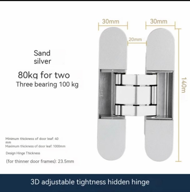 La charnière invisible est une charnière cachée réglable en 3D, ce qui signifie qu'elle peut être réglée en trois dimensions, ce qui permet une installation et une personnalisation faciles.La charnière est faite de matériaux de haute qualitéAvec une charge maximale de 120 kg, cette charnière peut facilement supporter même les portes les plus lourdes.